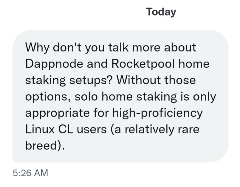 I love @DAppNode for the GUI access it provides to home stakers, and I really hold it in high regard, but I personally prefer cli interactions. I fully encourage others to promote Dappnode. I obviously talk a lot about RP. See also: the #stakefromhome tag. https://t.co/ytQgLgAxRl